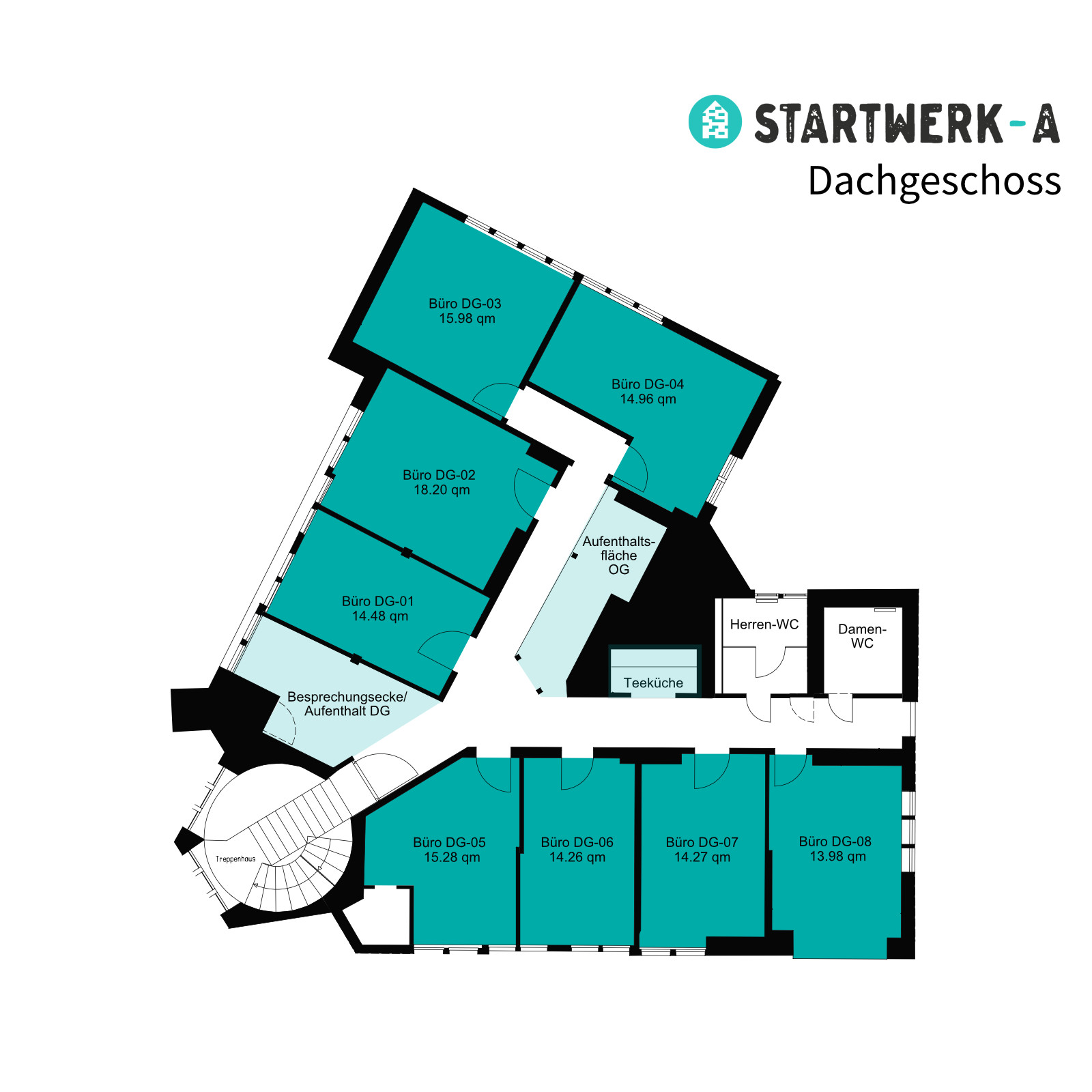 Verschafft Euch einen genaueren Überblick, wo welche Büroflächen und Allgemeinräume im Startwerk-A liegen. Ein Klick auf die Pläne öffnet die vergrößerte Darstellung.