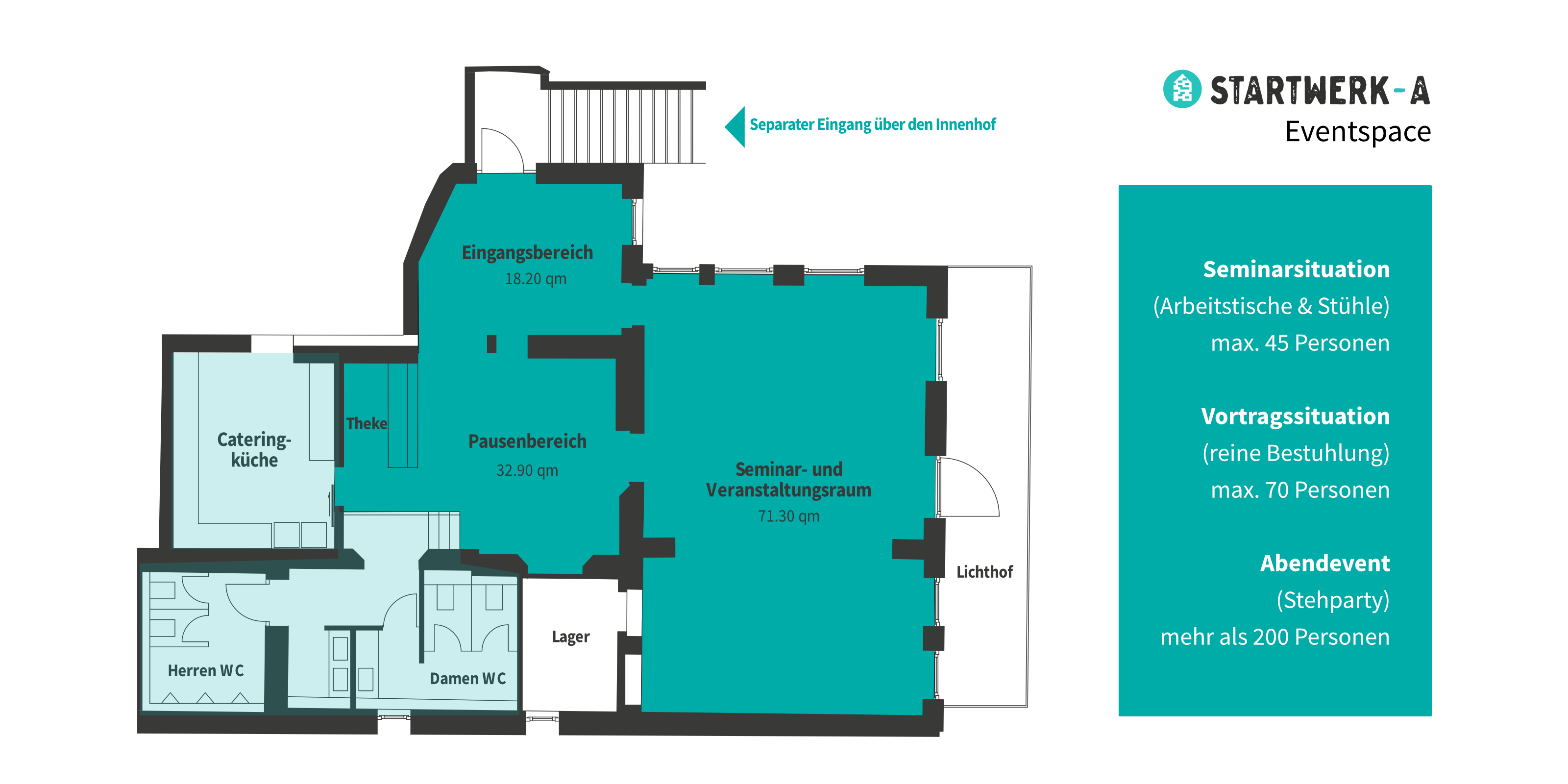 Auf 175 qm Eventfläche verteilen sich drei offene Bereiche, eine Cateringküche sowie die WC-Räume. Der Eventspace liegt im tageslichthellen Souterrain des StartWerk-A mit separatem Zugang über den Innenhof. Der ruhige Lichthof öffnet sich zur Rückseite des Gebäudes. Durch die Gegebenheiten des Altbaus ist der Eventspace nicht barrierefrei.